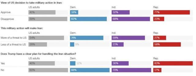 根据CNN提供的民调结果显示,有接近60%的受访者不支持特朗普对伊朗采取军事行动,有39%的受访者认为特朗普在采取军事行动前,没有尽全力尝试用外交手段解决问题。在路透社的一项调查中显示,有43%的受访者明确反对特朗普的这次军事行动。而路透社的这次调查还透露了一个值得深思的问题,那就是在没有明确政治倾向的中间选民中,也有44%的受访者反对发起这场战争。